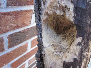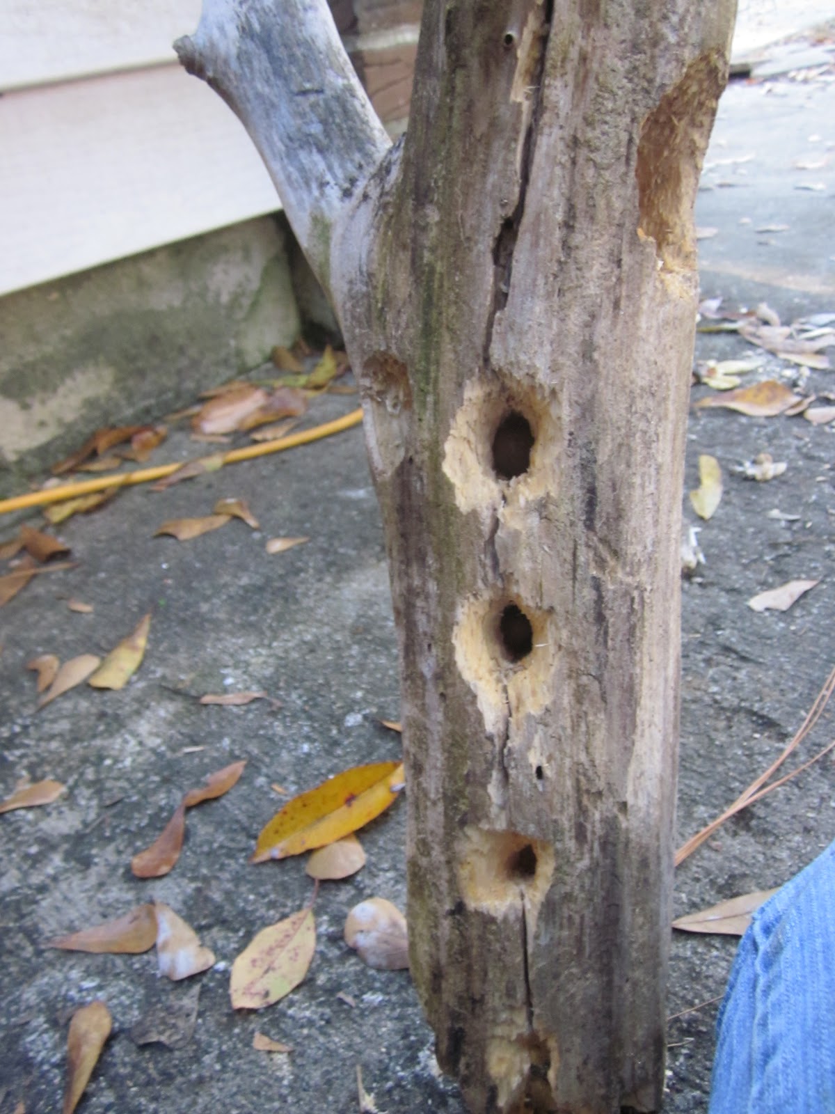 In the dead tree there were many round holes that the woodpeckers had made....we also found acorns hidden in all of the holes...we guess by squirrels. It was really cool!